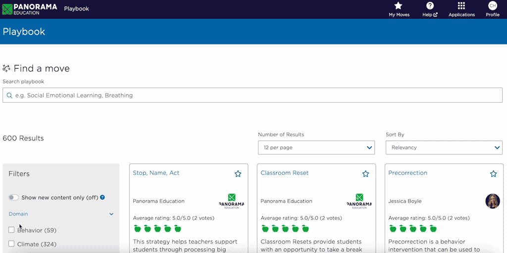 Educators can move from the understanding gained through Panorama data to taking action by filtering Playbook strategies by domain, tier, topic, rating, developmental stage, framework, and several other categories to quickly find best practices to meet their students' needs. They can save relevant strategies, to easily access them again.